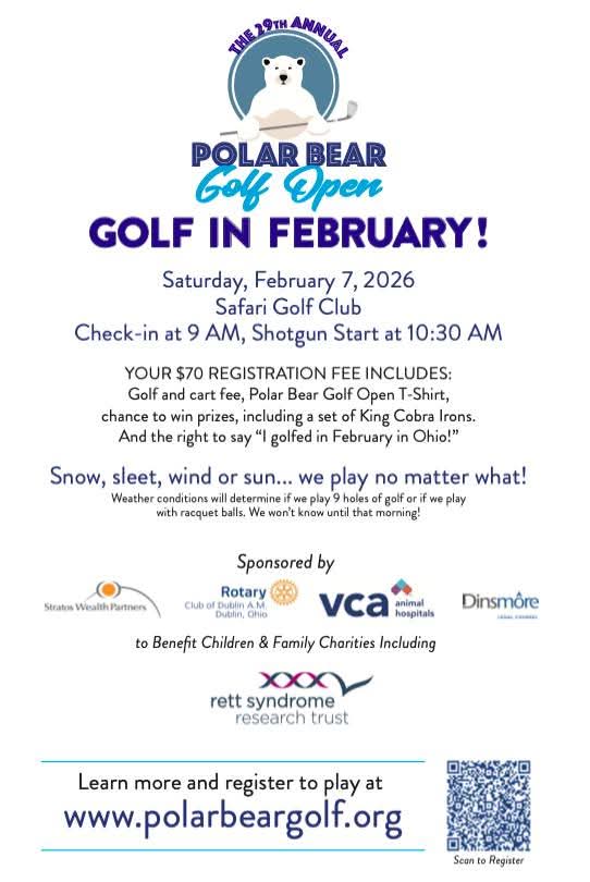 One of our signature events, the Polar Bear Golf Open is returning on February 7 at Safari Golf Club. Please be sure to spread the word to friends, family, and colleagues about this fun event. Not only will this event support the Dublin AM Rotary Foundation, but also the Rett Syndrome Research Trust to help find a cure for Rett Syndrome.