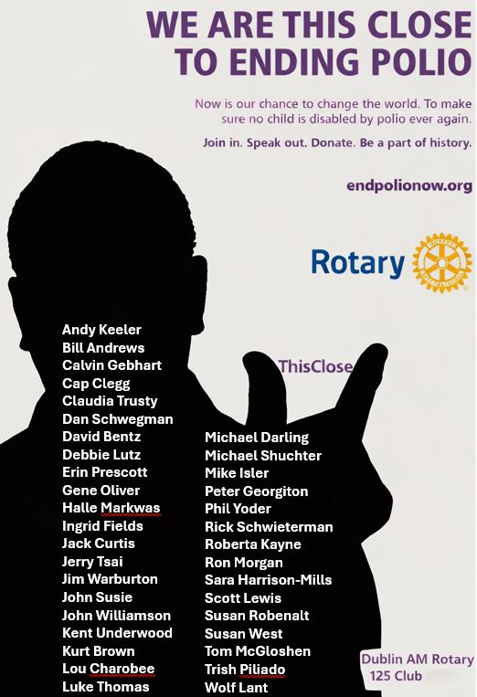 Thank you to the Dublin AM Rotarians who have chosen to support the 125 Club for the 2025-2026 Rotary Year and are listed below. You can still join the 125 Club by contacting Amy Barnhart to make a pledge.